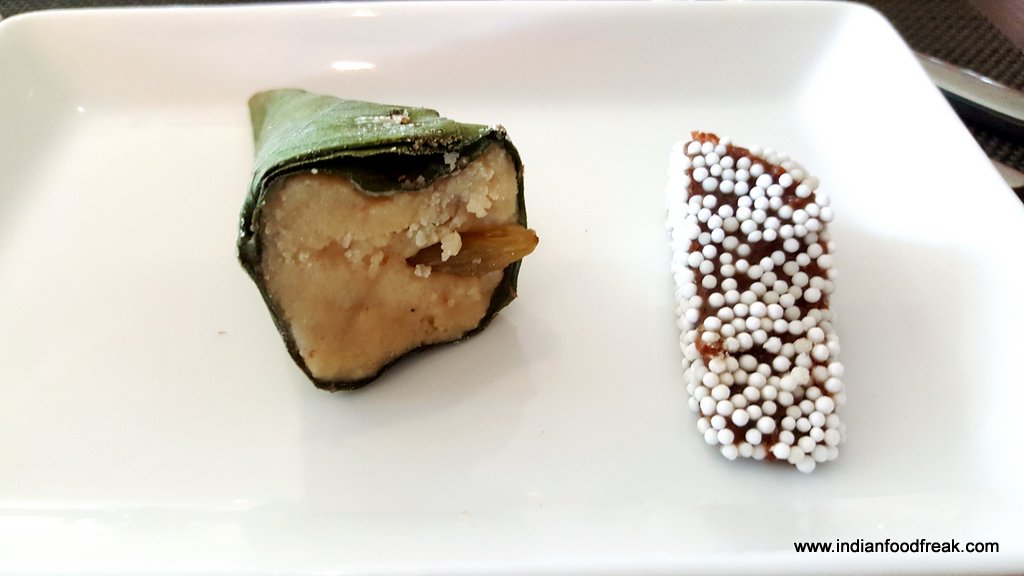 Now we thought that the meal is finally over, and another final round of desserts had arrived. Almora ki Bal Mithaai and Tehri ki Singori were the remaining two desserts that came to our tables. Bal Mithaai is a local sweet from Almora made of roasted khoa or mawa coated with tiny sugar pearls. Tehri is a town near Garhwal where this sweet Tehri ki Singori is made. It is prepared from khoa and is wrapped in Malu tree leaves.