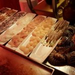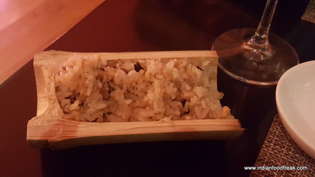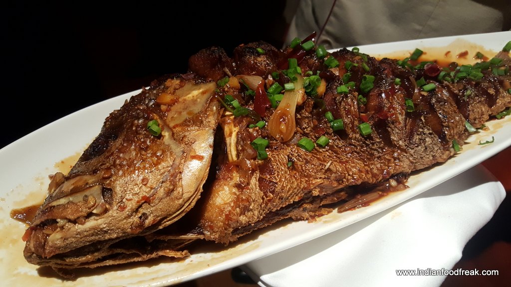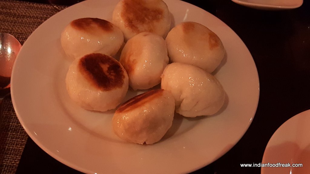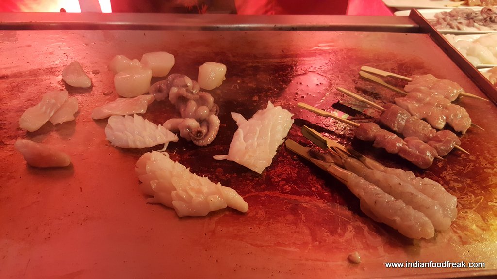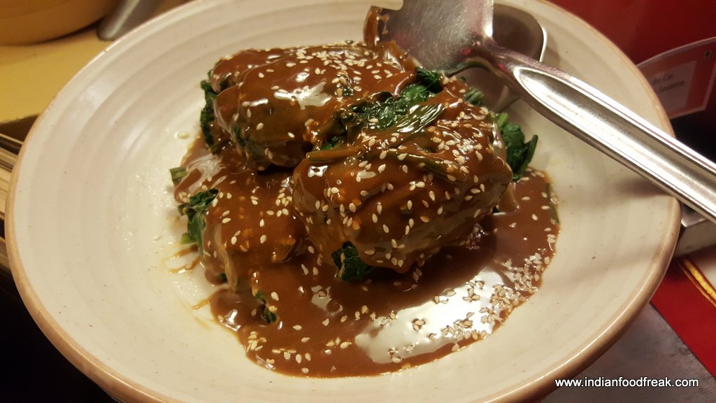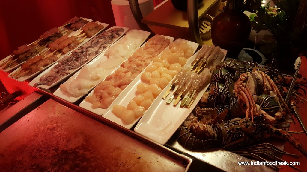 Chef Olivers kitchen at K3 JW Marriott includes Zhi Ma Bo Cai (spinach with sesame butter), Bai Zhuo Xian Lu Sun (steamed asparagus with Maggi soya), Yu xiang ji (stir fried chicken strips), Zhu tong fan (bamboo rice), Hong Shao dou fu (tofu with mushrooms), Cai Dan you yu (Octopus and celery salad) , Tang Cu Yu ( whole deep fried fish with rice vinegar rice), Shui Zian Bao (pan fried bao) besides other delicacies. Sea food from the hot plate included Octopus, squid, prawns, shrimp and scallop. The cumin sauce (one of Chef Olivers special sauces) used as a topping on scallops was interesting. For drinks I chose to have a Smoked dragon Fashion which turned out to be a good choice with the spread. The whiskey based drink with star anise, Cassia sticks and orange zest was a nice mix of flavours.