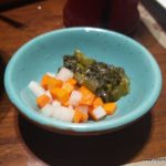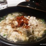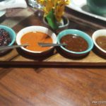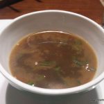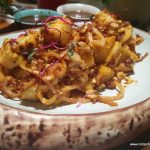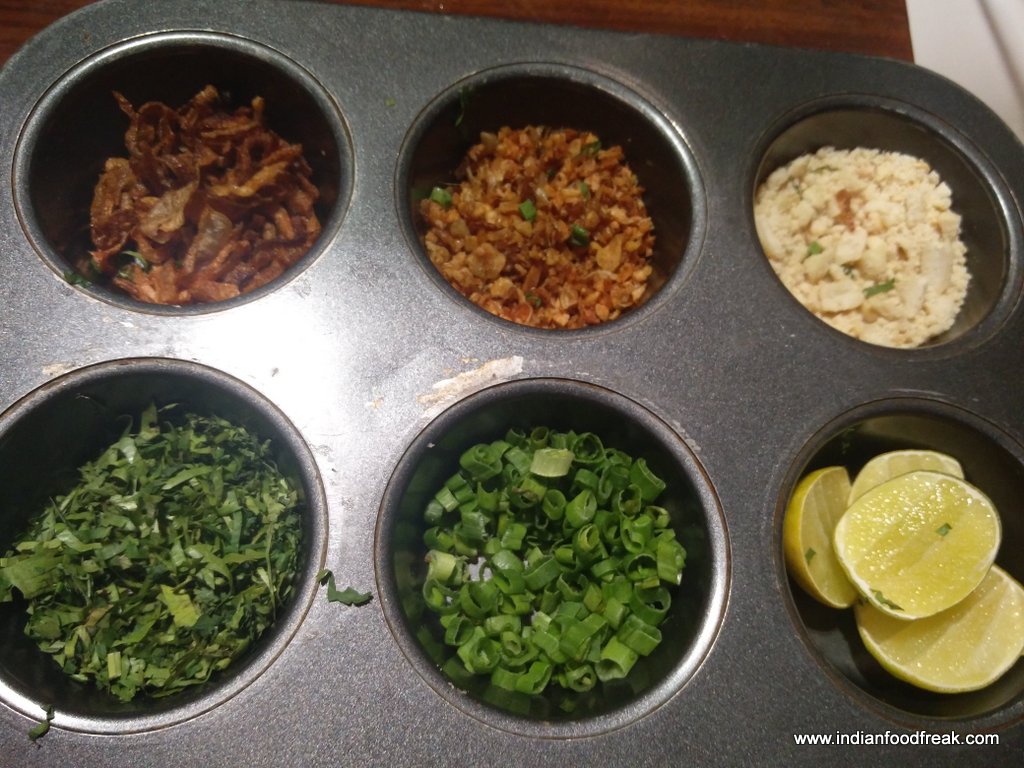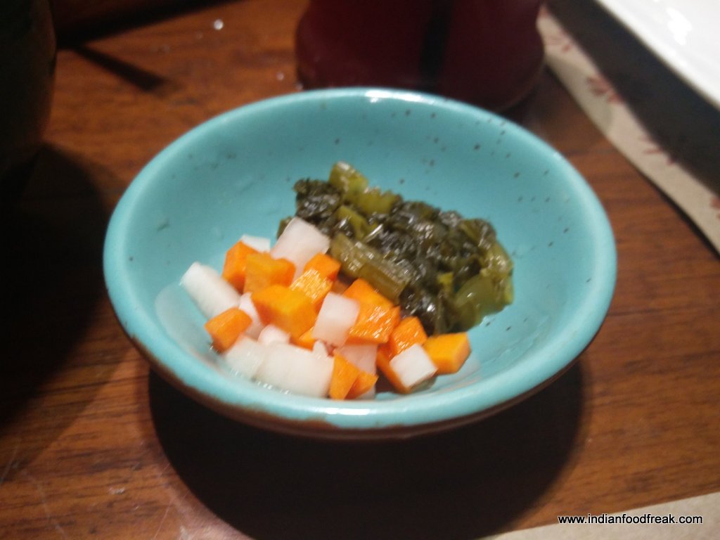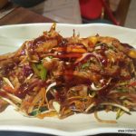 Shan Khow Suey was rice noodles with tomato relish, tofu with pickled mustard leaf, pickled carrot and radish as garnishes. I discovered that there are many types of Khow Sueys in Burmese cuisine. This one had a clear base broth which, after adding the Khow Suey condiments of fried onions, fried garlic, coriander leaves, green onion, lemon wedges and peanuts, couldn’t bring the Khow Suey together.