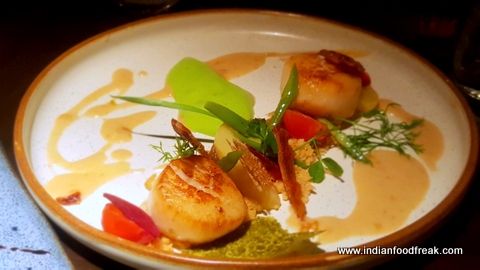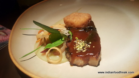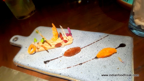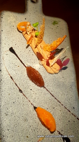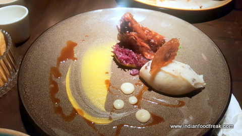 Chicken liver parfait Rs.280 – Carrot & Apricot Chutney, Cocoa nib jam – the liver parfait was light, fluffy and airy, the chutneys sweet and lovely with the nutty-buttery-salty liver parfait. Personally I am not a big fan of liver pate, but I would go back again and again for this parfait. Converting the paté into parfait is a brilliant move methinks!