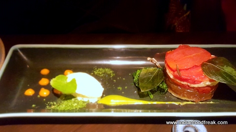 Steak tartare Rs.310 – Mustard ice cream, toasted baguette – Refreshingly simple and delicious, the herbs and slight lemony zing in the tartare felt so beautiful and the ohhh so creamy mustard ice cream was simply divine. Truly multi-dimensional.