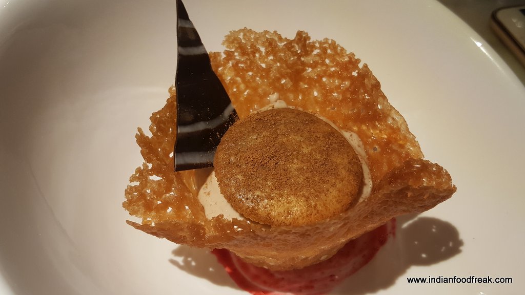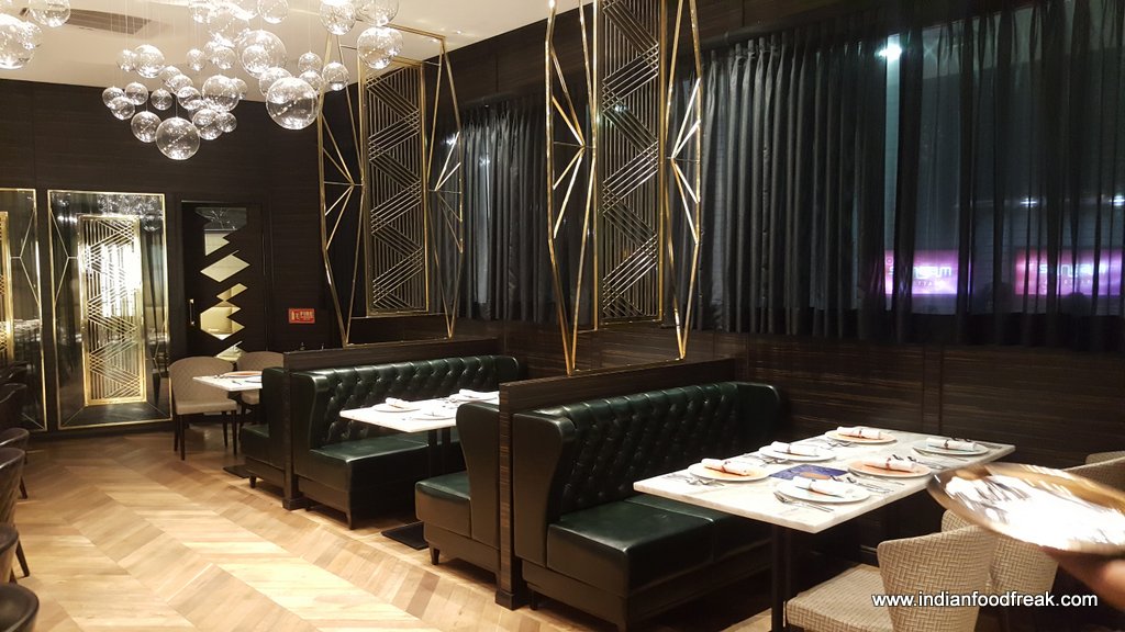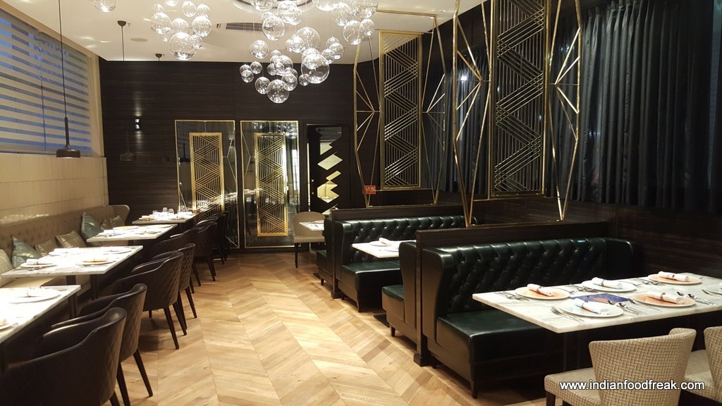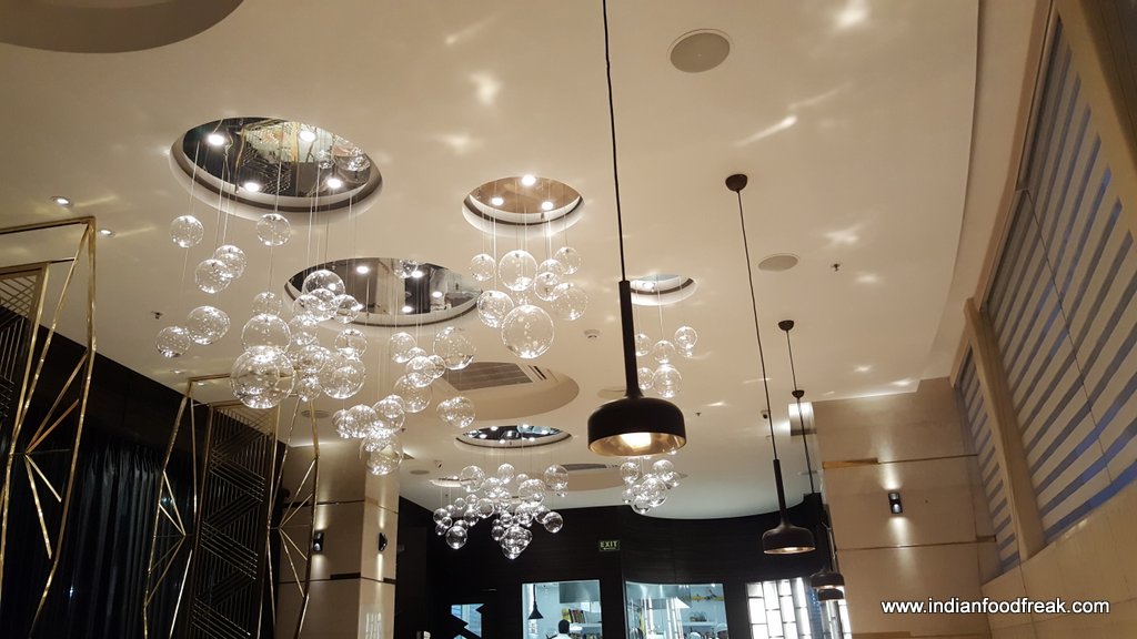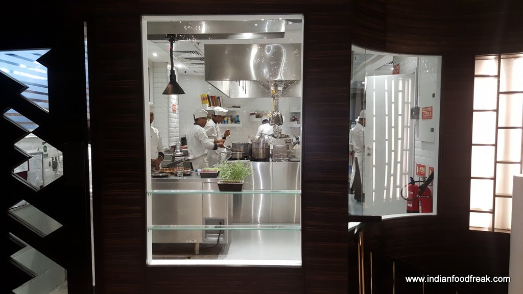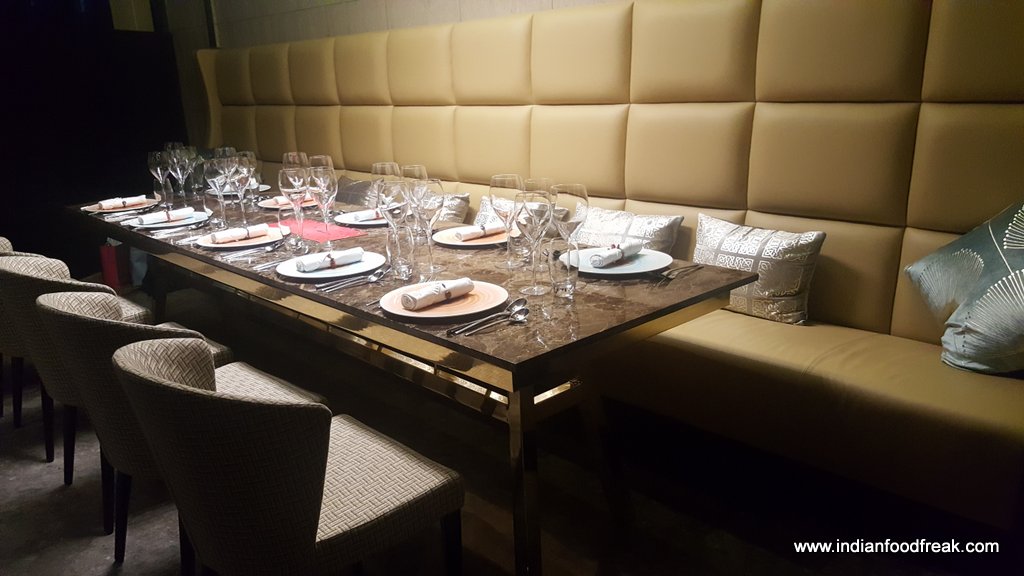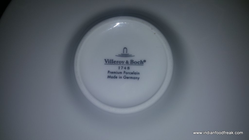 The restaurant is split over two levels – the ground floor has a bar and lounge and a spiral staircase leads you to the first floor which houses a fine dining restaurant (including one PDR) with a view of the glass wall kitchen. The classy fine dine décor in black, golden and beige, the made to order elegant crockery from Villeroy & Boch, cutlery from Cromargan and custom made corresponding coasters, table mats and menu cover prints (no two tables have the same coasters, mats and menu cover prints) give one a feeling of elegance and grandiosity.