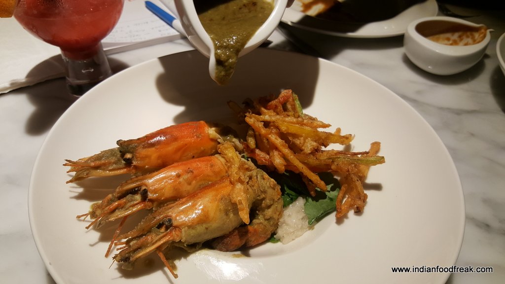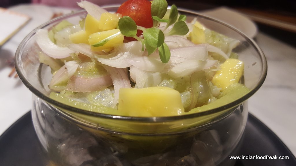 Ceviche de Camarones Shrimps cooked in the citric base of tiger’s milk and flavoured with yellow chilies is a Peruvian dish done only with white fish but is done here with prawns. It was an absolute delight with the tartness of lemons and raw onions and raw mango balancing each other.