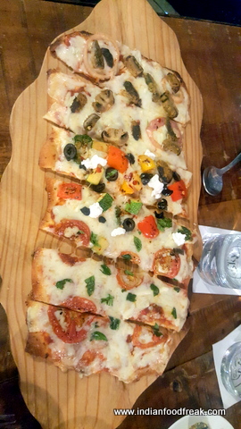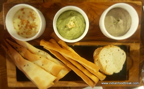 As if on cue, the staff was quick to bring us our starters and we started off with our starters comprising of an assorted Lavash and dips platter that contained a Roasted corn and garlic dip, a Zucchini and Cashewnut dip and a Mushroom and Cream cheese dip (Rs.250). While the Lavash and the breads were run of the mill (and soggy due to the rainy weather), the dips were beautiful, creamy and flavoursome. Truly a good start to the meal. Next up were Cornflake crusted vegetable triangles with tartar sauce (Rs.200); cornflakes have an inherent nature of soaking up oil and this showed in the dish too. Though the mixed vegetable filling was good, I couldn’t eat much of this platter due to the heavy oil. The last starter of this lot was the Wild Mushroom Arancini balls (Rs. 210); had it not been for the wild mushrooms, I would have surely written off the dish. The smokey wild mushrooms with cheese is always a happy marriage, and in the form of arancini balls served with port reduction and an orange mayo, it’s a dish that’s been cleverly put together to let each element shine.