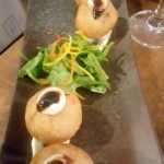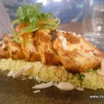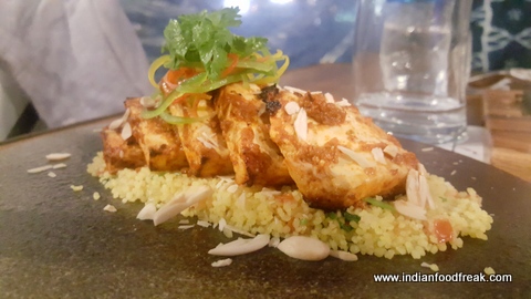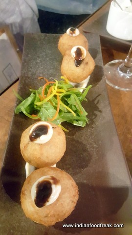 Even before I could finish my first drink, Shatbi was quick to order my next which was a Passion fruit and Chilli based cocktail. Tangy, sweet with an intense chilly kick, the drink worked beautifully during the monsoon rains. The Red Harissa Marinated Cottage Cheese (Rs. 210) was served next. I used to thinkthat I was not into Paneer but this platter of paneer in a Red Harissa sauce served on a bed of Quinoa salad, changed my notion. The Harissa lend quite a bit of flavour to the smokey meaty Paneer but the real star of the dish was the Nutty, slightly citrusy quinoa, a bit dry, but packed with good flavours. This, along with the Arancini were my dishes for the evening.