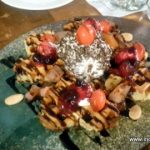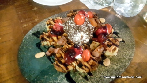 Closing my evening with a Classic Old Fashioned and a Moscow mule was another great decision because the Wood Fire over Pizza, that was served next, though properly conceived and cooked, could not shine due to the high humidity of the atmosphere as the bread got soggy even before we could bite into them. The dessert platter consisted of Waffles topped with chocolates, fruits and nuts, which was quite an unusual dessert to end a dinner, I would usually associate it with breakfast, but nevertheless it was proper.