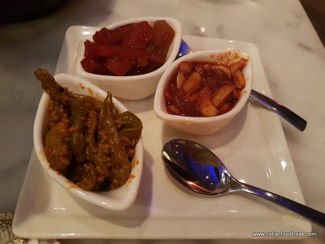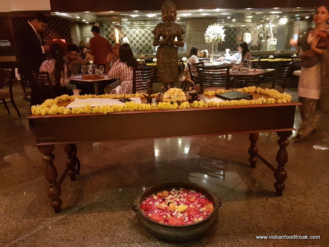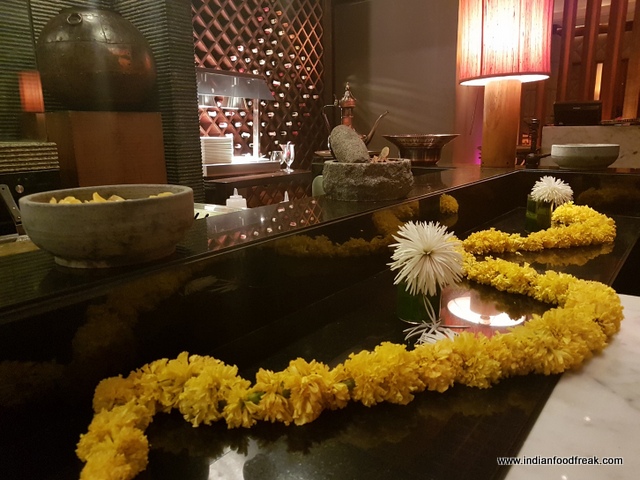 The ambiance was traditional with an abundance of marigold all around. The lights at Masala Bay were a touch more muted than what I prefer. (I like to see the food and its colours very clearly). Our table offered glimpses of the kitchen through glass walls, I enjoyed that while we waited. And waited quite a bit we did – an aberration from the usually prompt service of the restaurant.