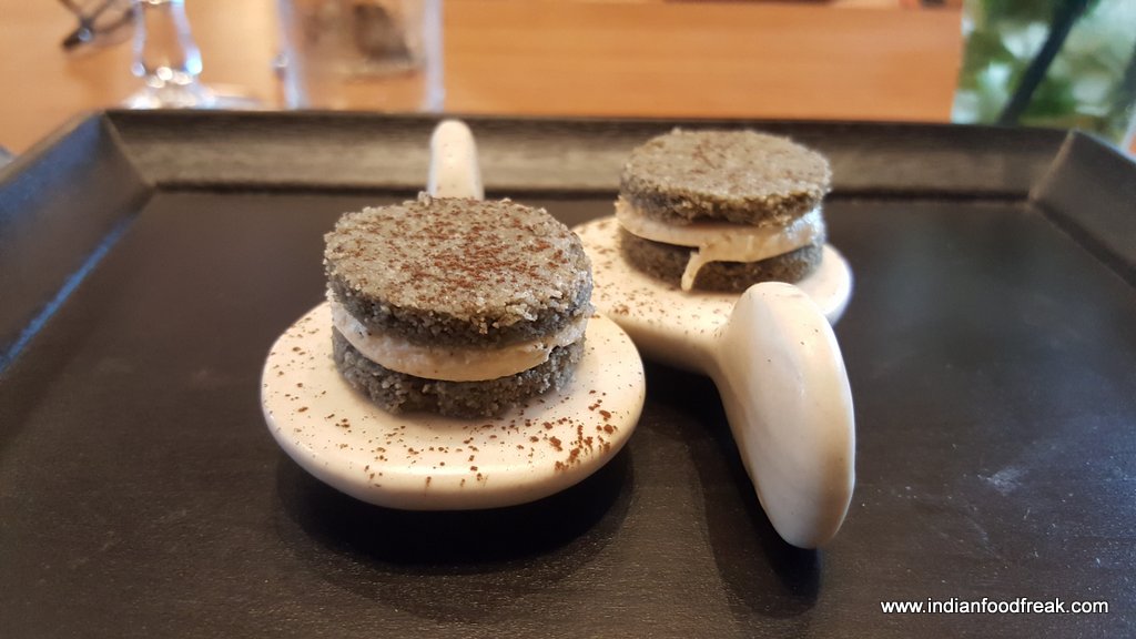 The meal begins with black olive that looks like oreo biscuit with goat cheese (amuse boche) which is served complimentary to guests. A tasty start certainly with the oreo almost melting in the mouth variety.