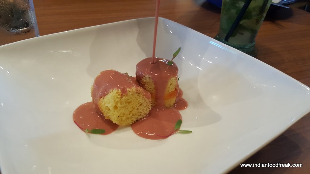For starters my friend and I chose to have Puffed Aloo chaat, Sol kadi Gazpacho (dhokla rolls in chilli caviar and served as a soup) and Kanjivaram idli Sambhar with Madras gun powder.  The puffed aloo chaat consists of crispy airy aloo which I absolutely enjoyed till the last piece. The chaat has a mix of tandoori fruits consisting of green apple, pineapple, pear and pomegranate. An interesting chaat which would appeal to the taste buds of non chaat lovers too.