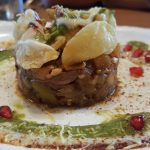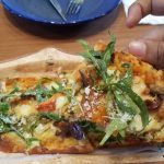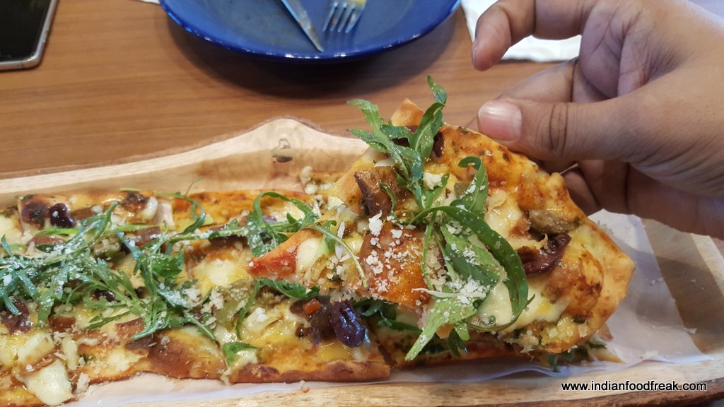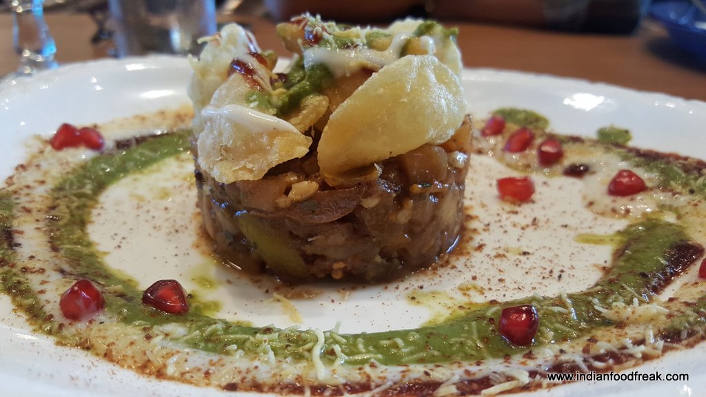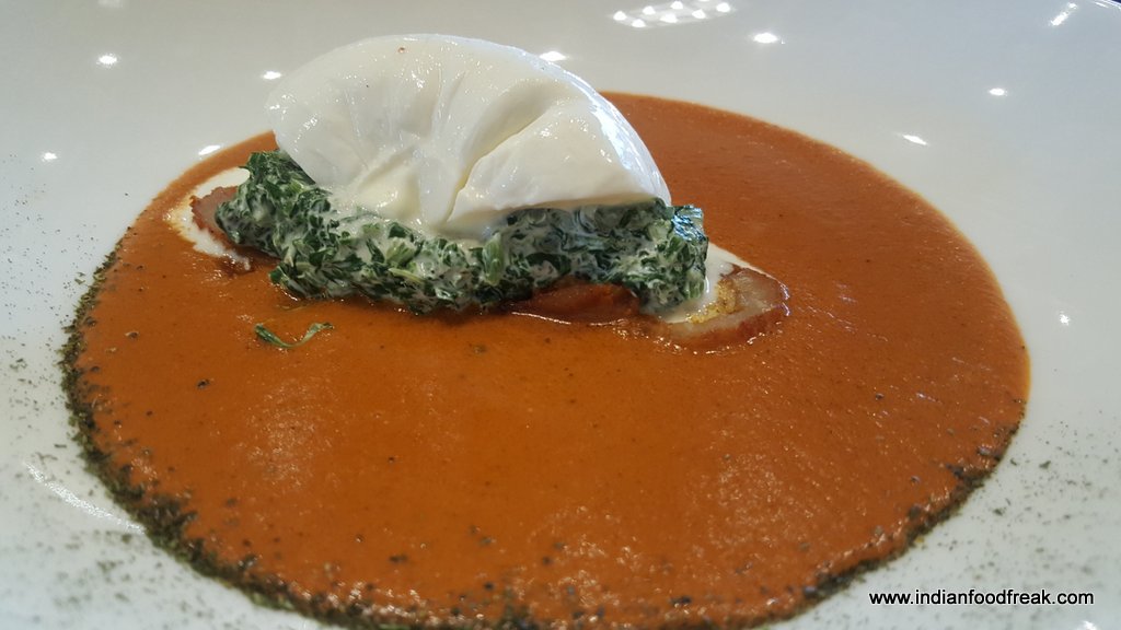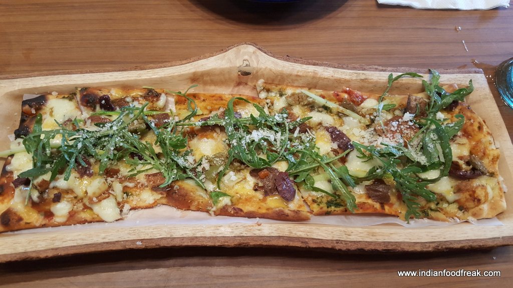 For the main course we had Pizza Asparagi and Burrata Makhani. Pizza Asparagi consisting of caramelised asparagus, kalamata, young potato skin, grated parmesan,dressed arugula leaves. Absolutely tasty, well balanced and a  perfect crispy base. Thoroughly enjoyed it and this is one dish that I would strongly recommend everyone to try. Burrata makhani consisting of burrata cheese, organic tomato makhani and tandoori aloo. To give credit to the Chef he has tried experimenting with various dishes and combinations on the menu. However this experiment did not ring a bell for us. Burrata which is an Italian Cheese was introduced on the Indian food scene a while back therefore not many would be accustomed to its taste and may not agree with everyone’s palate too. The combination of the hot makhani gravy with the cold cheese didn’t go well.  Moreover the size of burrata was like a block of cheese has been put in the hot gravy and the two tasted as distinct dishes rather than adding to each other’s flavor.