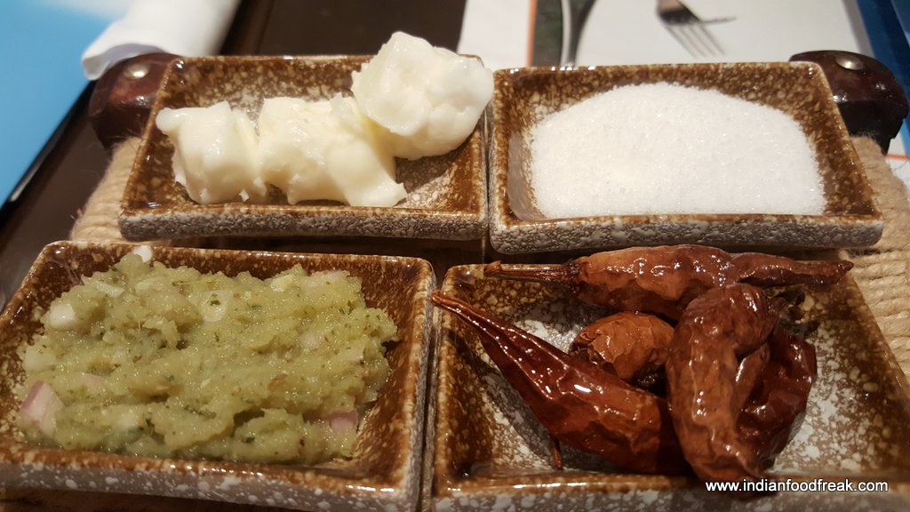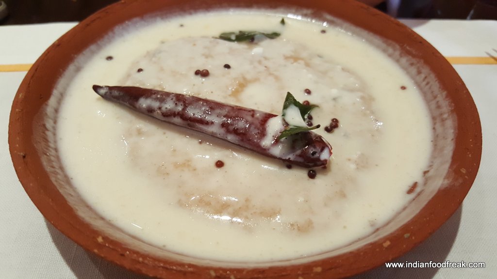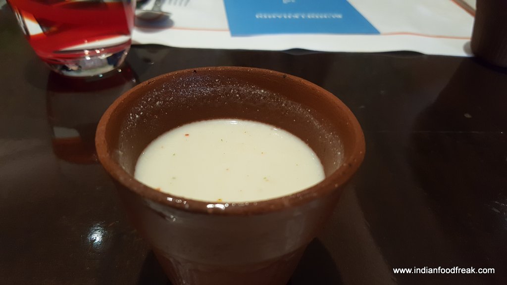 The start to our meal was mattha, spiced buttermilk served in true authentic style in kullads. The mattha was so addictive that one could not stop at just having one helping of it. What arrives next at the table is Bara (split black lentil dumplings soaked in buttermilk tempered with mustard seeds). We are told by the manager that one is supposed to add crushed sugar provided at the table to these dumplings to eat it as per their tradition.