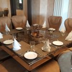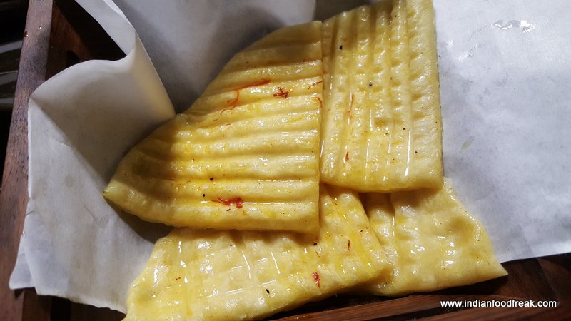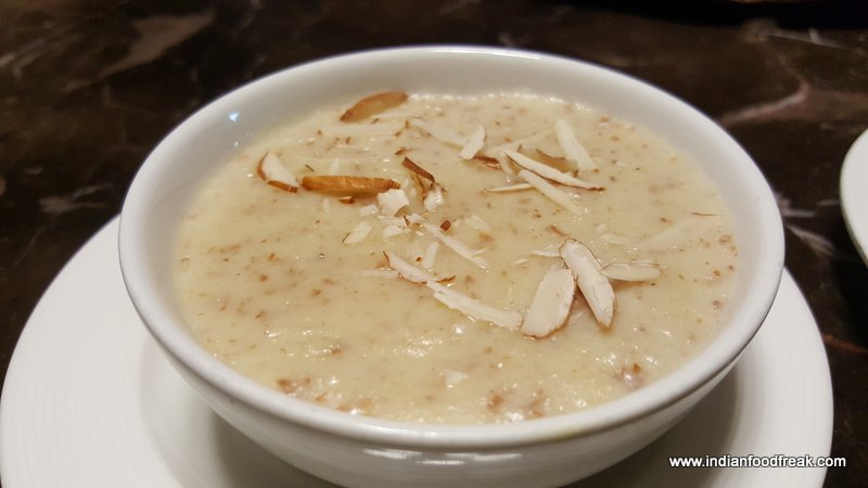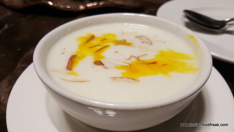 A royal meal must end with a sweet befitting royalty. Badaami halwa and Phirni it is for us. A lovely dessert to have ended the meal with we wiped it off to the last bite with just the right amount of sweet, only wished it would have been roasted a bit more like we make at home. However it certainly did not lack in taste. What was missing was the consistency of Phirni. It was flowing just like milk and in my experience we never had such Phirni, though Chef Hussain had other opinion.