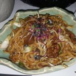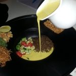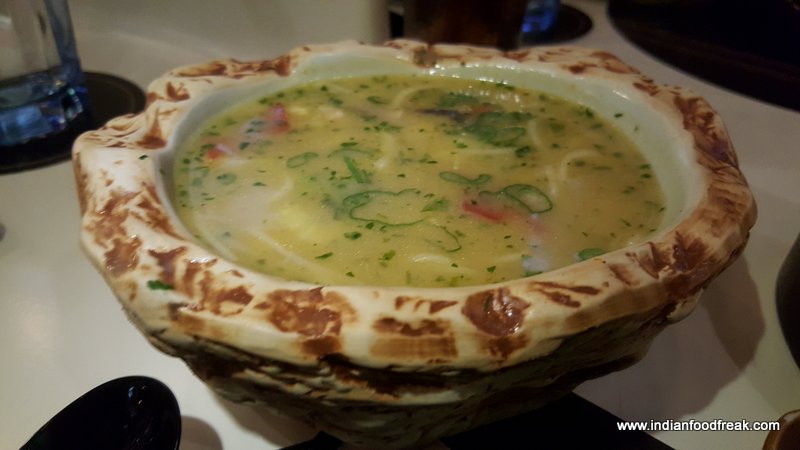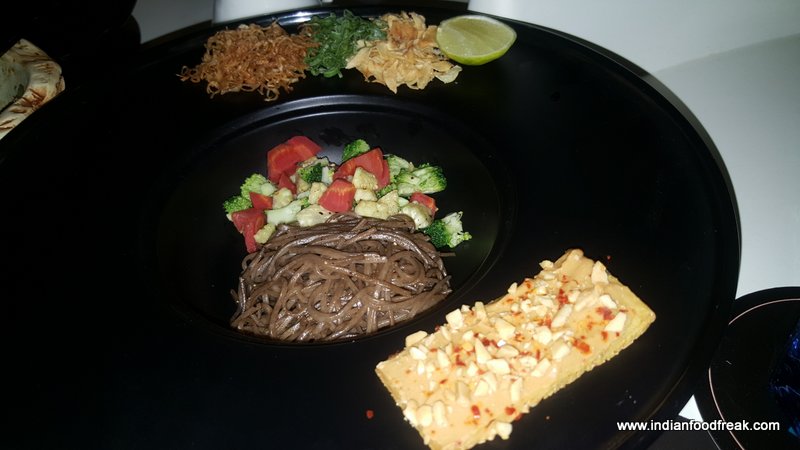 Khow Suey was served in a big bowl with the accompaniments kept on the outer rim of the custom made bowl. A very unique ingredient was the garlic chips sprinkled with lemon salt which acted like a tangy treat in the mouth. Also adding to the flavor was freshly grated lemon rind.