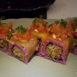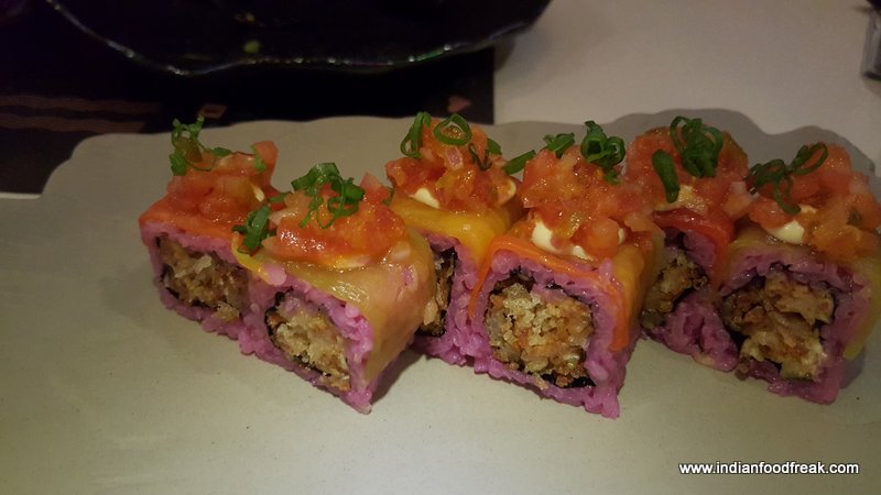 Vegetable Rainbow Rolls were more visually attractive than any sushi I’ve seen. Crispy mixed vegetables were wrapped with nori sheets and beetroot juice infused rice, draped with smoked bell peppers, mayonnaise and pepper sauce and topped with onion and tomato salsa. Another refreshing treat for the palate with a little bit of Japanese and Mexican medley if you may.