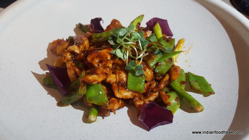Chicken Chili Oil Pot Stickers has the chicken in unique partnership with dehydrated carrot bits. The carrot bits added a nice crunchy element to the dish totally elevating it. The presentation of the dish was beautiful as the pot stickers came camouflaged under a thin, crisp rice sheet which again gave a crunchy contrast to the dish.