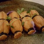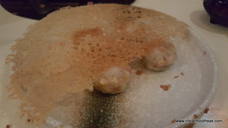 My friends and I started the palate ride with Petite Idli Melon Melody which had the dense idlis contrasting texturally with two types of juicy melons. The dish also had crunchy pine nuts and was drizzled with togarashi spiced Japanese mayo. A simple dish but who would have thought of bringing idlis together with a juicy fruit – a fabulous idea! With each bite, the melons burst in your mouth dousing the spiced idli with juice.