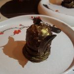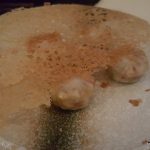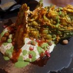 24 Carat Prank Chat was crisp whole spinach leaves batter fried and standing on a bed of dahi bhalla hummus drizzled with tamarind and mint chutney and (in keeping with the name of the dish) garnished with gold leaf vark. By keeping the spinach leaves standing, the chef got rid of soggy spinach leaves. Prankster had introduced the dahi bhalla frozen ice cream and now there is this dish as a further innovation on the dahi bhalla!