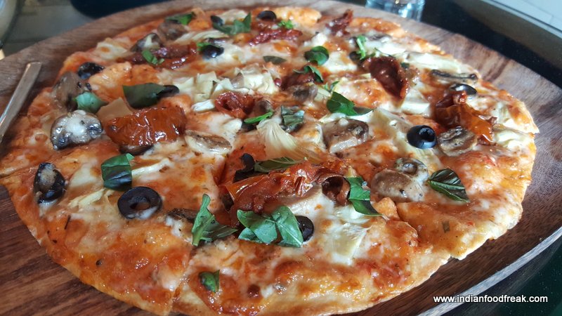 The Norwegian pan seared salmon is a must have here. Served with orange and fennel cream , charred asparagus and shock fried fennel this is a treat for fish lovers. A mix of veg and non veg is always good for people like us who eat both so we decide on a veg pizza. Capricciosa it is for us. The pizza crust is excellent with a topping of mushroom, artichoke, olives and sundried tomatoes.