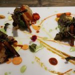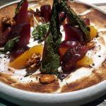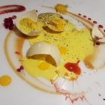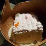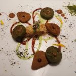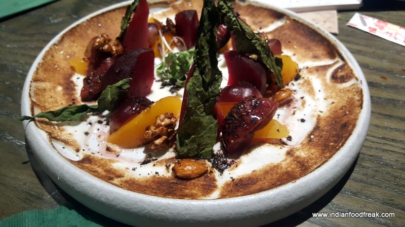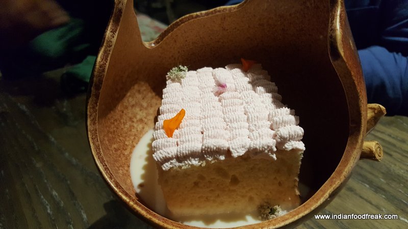 Who Burnt The Forest Salad was next which, true to its name, was reminiscent of a fire. A perfect burnt look, coming from a blow torched egg meringue surrounding the salad on a circular plate. The centre of the plate had wine poached pear, peach, California grapes, beetroot and was sprinkled with roasted kale and olive dust and served with hung curd lassi. This salad may not appeal to all as the hung curd was sweet and the diet watchers may not approve of it. However, I enjoyed eating it.