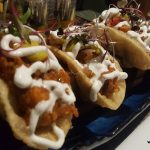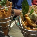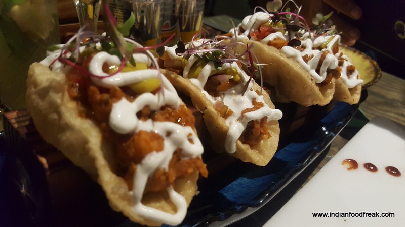 Chola Bhatura Taco – Yes! The chola bhatura has travelled to Mexico to be reborn as this new dish. A crisp bhatura taco shell filled with chole and topped with sour cream and guacamole. Only thing lacking in this innovative dish was a sour kick to the cholas which anardana or finely chopped green mango added to it could have accomplished. Nevertheless, a lovely innovative take on chola bhaturas.
