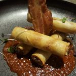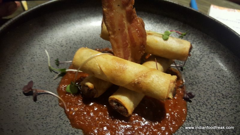 Pork Belly Rolls were Thai pulled pork spring rolls served on a bed of spicy Asian tomato sauce. Crisp rolls loaded with pork and the sauces it was simmered in along with the spicy and tangy tomato sauce were an absolute treat. A crisp bacon standing vertically supporting the rolls was the cherry on the cake so to say.