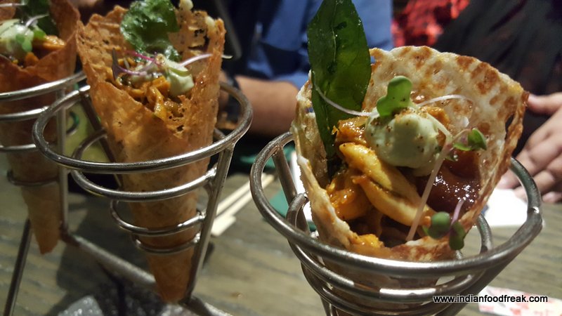 Dosai Cornetto was a lovely, innovative, easy to eat finger food. Fresh, crisp waffles made in a cone shape stuffed with a tamarind base chicken curry, yoghurt mousse and foam chutney. Absolutely enjoyed eating this savoury softy.
