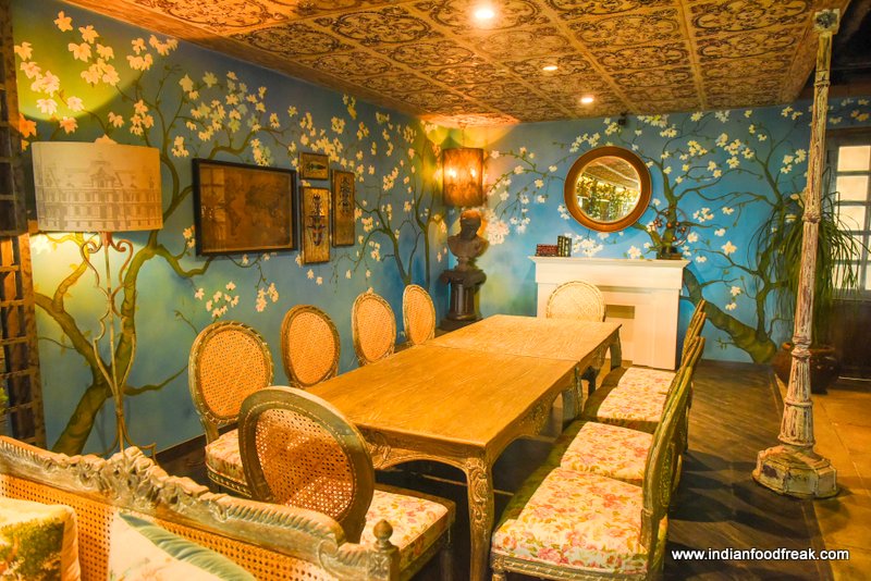 It feels as if there are a lot of different seating areas inside as the boredom of seeing the same furniture all through the restaurant is something you will not find here. The seating itself is quite comfortable, there is Victorian tiled ceiling, corbelled stone wall and a Van Gogh inspired painted blue wall in one corner not to mention the worn off/aged wood finish furniture, pillars, British vintage décor, lamps, chandeliers, oil paintings and a fire place all of which show the minute detailing gone into doing up the place.