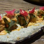 Now coming to the food, we started our tasting journey with Lychee Lollypops. They arrived on the table with full drama with smoke coming out from a flat dish from under the mason jar it was served in. The lollypop look alike lychee stood vertically balanced on a satay stick waiting to be devoured. It was stuffed with wasabi feta mousse and coated with Japanese 7 spice, tempura flakes and sesame chili flakes. I felt all it needed was a little bit of tartness to cut the chili hit to make it wow.