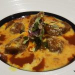 Laboratory Lamb Chops are served with full fanfare. The chef comes to your table to assemble together lots of different sauces like sweet potato puree, rogan white gravy, saffron gravy and laal maas gravy. Then the chef puts some sautéed vegetables and finally the pre cooked three huge lamb chops along with three mini garlic cheese naans in three different places on a huge white board. The chops were cooked well in a mild lagan and curd coriander base and are definitely value for money. However, the sauces on the board needed seasoning to bring the dish together.
