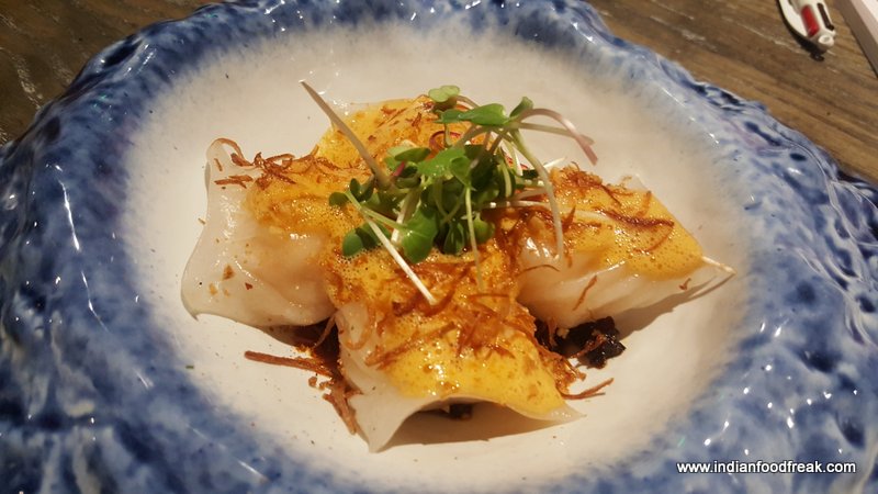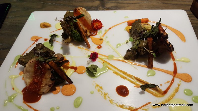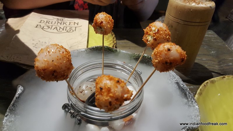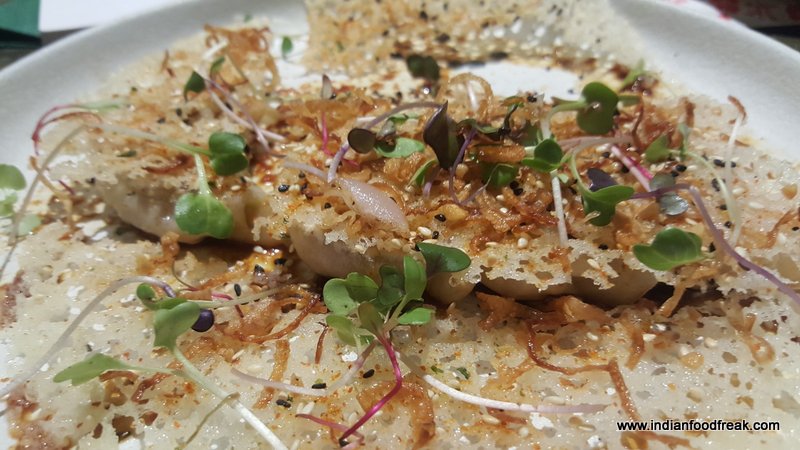 Now coming to the food, we started our tasting journey with Lychee Lollypops. They arrived on the table with full drama with smoke coming out from a flat dish from under the mason jar it was served in. The lollypop look alike lychee stood vertically balanced on a satay stick waiting to be devoured. It was stuffed with wasabi feta mousse and coated with Japanese 7 spice, tempura flakes and sesame chili flakes. I felt all it needed was a little bit of tartness to cut the chili hit to make it wow.