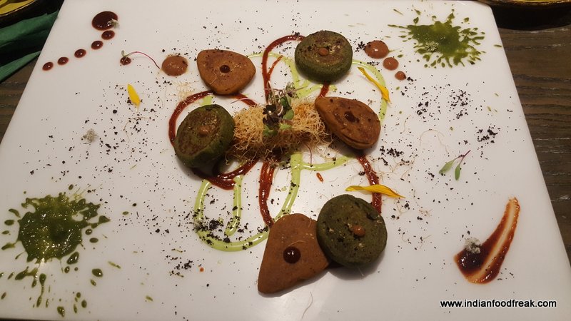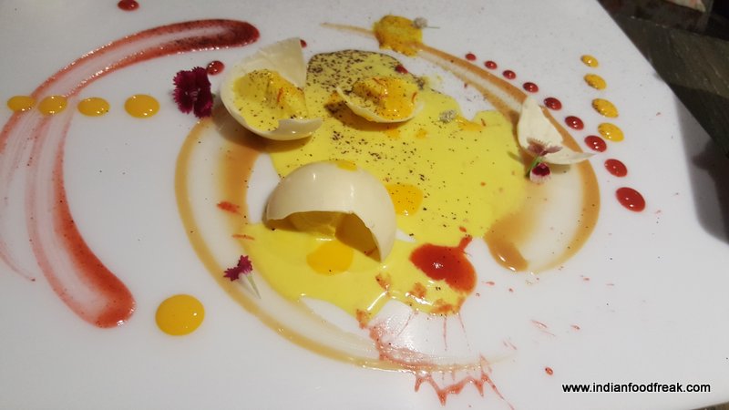 Who Burnt The Forest Salad was next which, true to its name, was reminiscent of a fire. A perfect burnt look, coming from a blow torched egg meringue surrounding the salad on a circular plate. The centre of the plate had wine poached pear, peach, California grapes, beetroot and was sprinkled with roasted kale and olive dust and served with hung curd lassi. This salad may not appeal to all as the hung curd was sweet and the diet watchers may not approve of it. However, I enjoyed eating it.