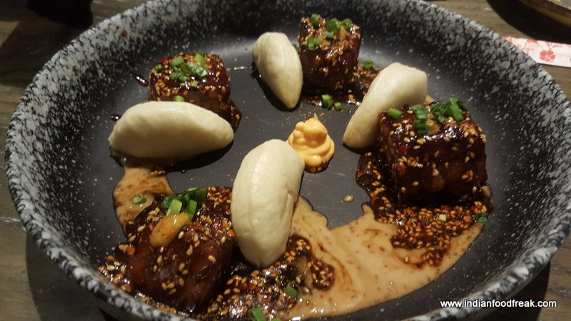 Pork Belly Rolls were Thai pulled pork spring rolls served on a bed of spicy Asian tomato sauce. Crisp rolls loaded with pork and the sauces it was simmered in along with the spicy and tangy tomato sauce were an absolute treat. A crisp bacon standing vertically supporting the rolls was the cherry on the cake so to say.