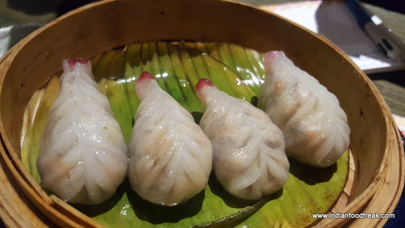 Mushroom Dimsum were finely chopped shitake mushrooms, baby corn, carrot and brocolli loaded crystal dim sums served with a burnt chili dip and a spicy chili sauce. A mushroom lover’s delight no doubt.