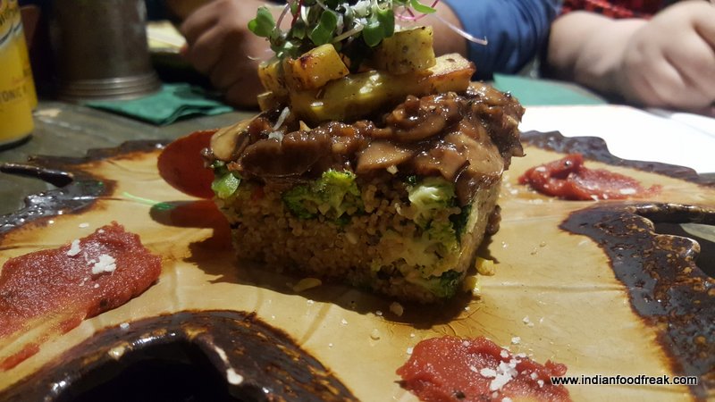 Quinoa and Couscous Pulao is a must try dish. Al dente quinoa and couscous pan tossed with some vegetables like bell peppers and broccoli and topped with mushroom stroganoff and roasted sweet potato fingers. What it had going for it was different textures (soft and creamy mushrooms with crunchy vegetables) and different flavors.