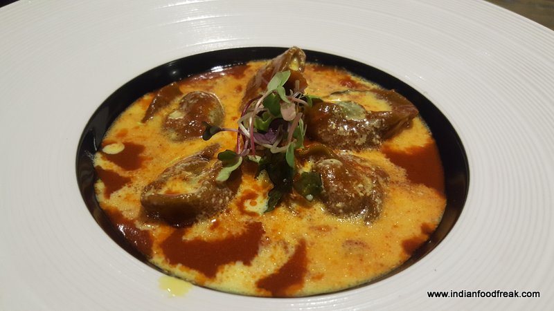 Dosai Cornetto was a lovely, innovative, easy to eat finger food. Fresh, crisp waffles made in a cone shape stuffed with a tamarind base chicken curry, yoghurt mousse and foam chutney. Absolutely enjoyed eating this savoury softy.