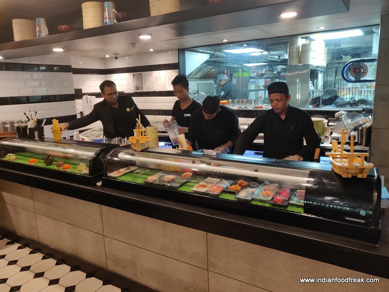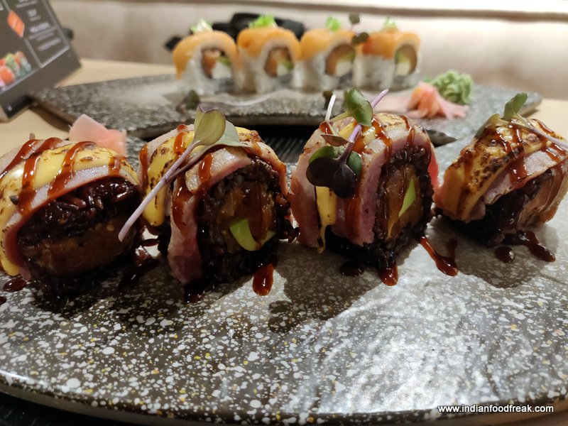 We are seated to begin the true Japanese experience of Sushi, Sashimi, Dimsum and Ramen which is an integral part of Japanese cuisine . One look at the Menu and the variety they offer in Sushi certainly impresses. We choose Super Philli Cheese Roll which has smoke salmon and creamy Philadelphia cheese and Tuna tataki consisting of crisp onion flakes, charred tuna, avocado and cheese. While we found the former absolutely delicious and is on our recommended list the latter was a bit spicy since it was high on Sriracha sauce. Considering it is Sushi one normally expects it to be mild. The restaurant offers Sushi with a choice of white or brown rice though white rice certainly remains the preferred one.