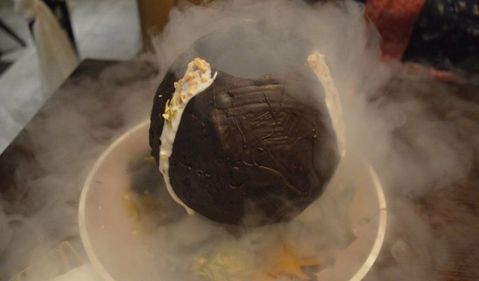 Safed Haleem with Sago Fritters – the first flavour you get is of ghee, then the rich dalia and mutton haleem and those aromatic whole spices used in the preparation. Then this creamy delight is sitting on top of a crisp sago fritter and activated charcoal tulie. Totally heavenly indulgence if you ask me. Who would have thought of serving a main course meal as a starter.