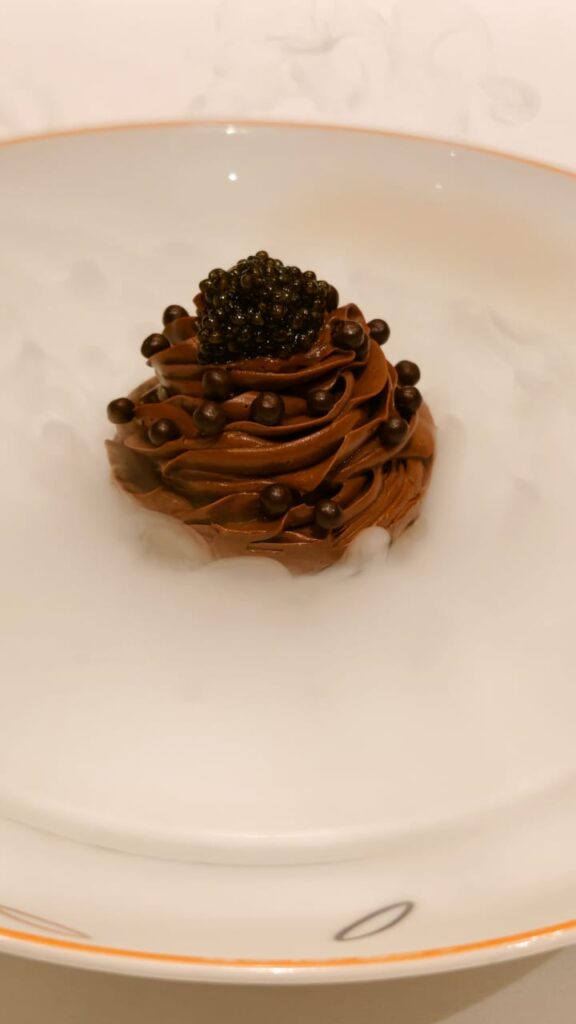 Dessert keeps things interesting. A Single Origin Chocolate Mousseline with sea salt and a touch of caviar. It sounds unusual, but it works. The salt sharpens the chocolate, and the caviar adds tiny bursts that keep each bite engaging.