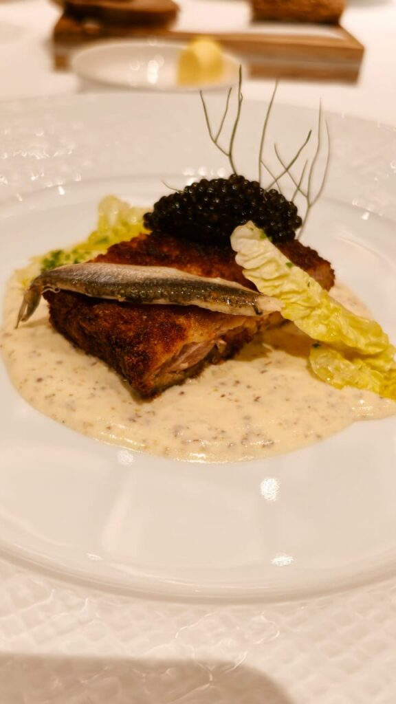 The Spanish Chicken Cotoletta might seem like a detour for a seafood menu, but it works. Crisp, indulgent, and elevated with Oscietra caviar and anchovy, it acts as a comforting pause before the seafood returns.