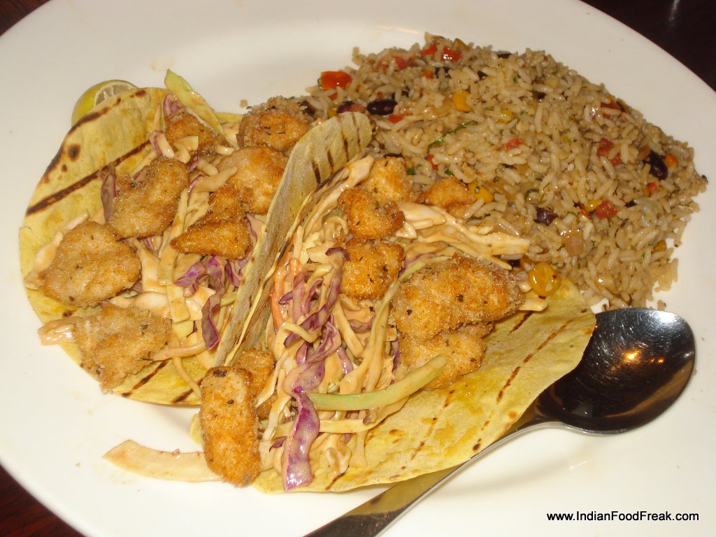 Next arrived the pizzas (main course), the Baja Supreme Pizza (Veg) and the Chicken Carnitas Pizza. Also on the main course was Adobo Tacco, a dish of corn flour tortilla chicken nuggets, slaw and Mexican rice,