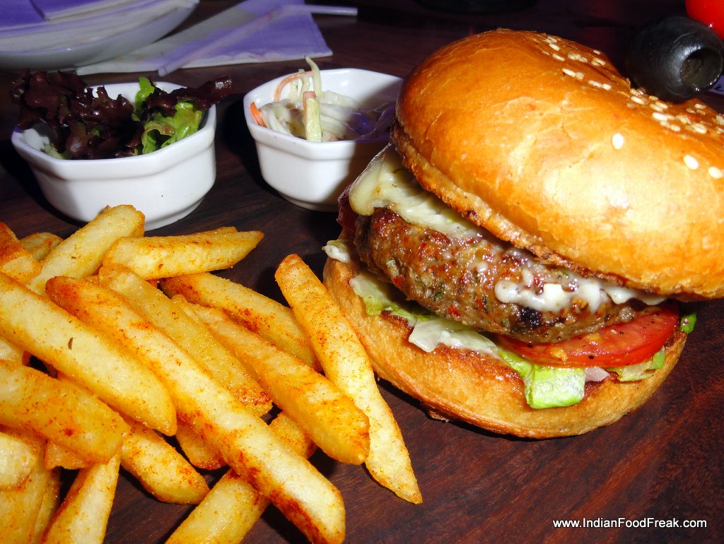 Sicilian pizza The first to arrive is actually the highlight of the meal – the vegetarian Amsterdam style Sicilian pizza (Rs 395), a thin-crust pizza topped with red chillies, mushrooms, cocktail onions, tomato sauce and mozzarella. The crust is perfectly baked and the combination of tastes and textures is simply superb. This is the best vegetarian pizza I have had in Delhi NCR. With our taste buds still tingling we go on and taste the next dish – shredded tenderloin sautéed with shiitake mushrooms (Rs 525). The first thing we discover is the excellent quality of the Amsterdam sourced beef that has been cooked to a melt-in-mouth taste. The meaty mushrooms and the accompanying brown sauce with cream and mustard compliment the dish perfectly. Tsix oz chilly beef burgerhe wow factor continues with their six oz chilly beef burger (Rs 425). Finally I get a burger where the patty is soft and moist and the bun does not disintegrate in the hands, which is a rarity in Delhi NCR. The cocktails are also great – I have ‘cool as cucumber’ (Rs 495), a combo of fresh cucumber juice, ginger and gin, which is not cloyingly sweet, refreshing and a great palate soother. Pawan has the naughtily named exciting drink foreplay which is combo of gin, fresh pineapple and a vanilla pod, muddled, shaken and double strained.