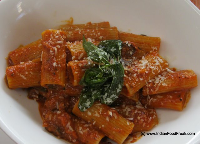 I ask the chef for his suggestions on what to eat. Justifiably proud of his menu, he suggests many dishes. I start with rigatoni alla siciliana con tonno olive, capperi e pomodoro (rigatoni pasta scented with tuna oil, anchovies, capers, black olives in tomato sauce, Rs 495). The rigatoni, a tube-shaped pasta somewhat larger than penne, is a perfectly cooked pasta with layers of flavours. The tomatoey, garlicky initial burst progresses effortlessly to the briny flavours of the sea, leaving a happily tickled palate. The petti di pollo grigliati al limone con funghi e purea di patate (grilled chicken breast, with lemon sauce, and sautéed mushroom, Rs 395) has juicy fillets delicately grilled to keep them moist, perfectly accompanied with asparagus, mushrooms and peppers, with a gentle citrus undertone.
