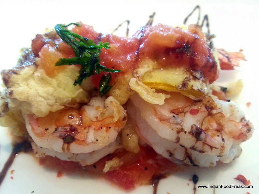 The simple Prawn rolled in sliced and fried Zucchini and doused with freshly prepared, spicy arrabiata sauce kickstarted the palate with its biting heat quotient rendered by liberal use of chillies. The prawn was done perfect, succulent and contrasted ably with the crunchy Zucchini wrap and the spicy sauce.