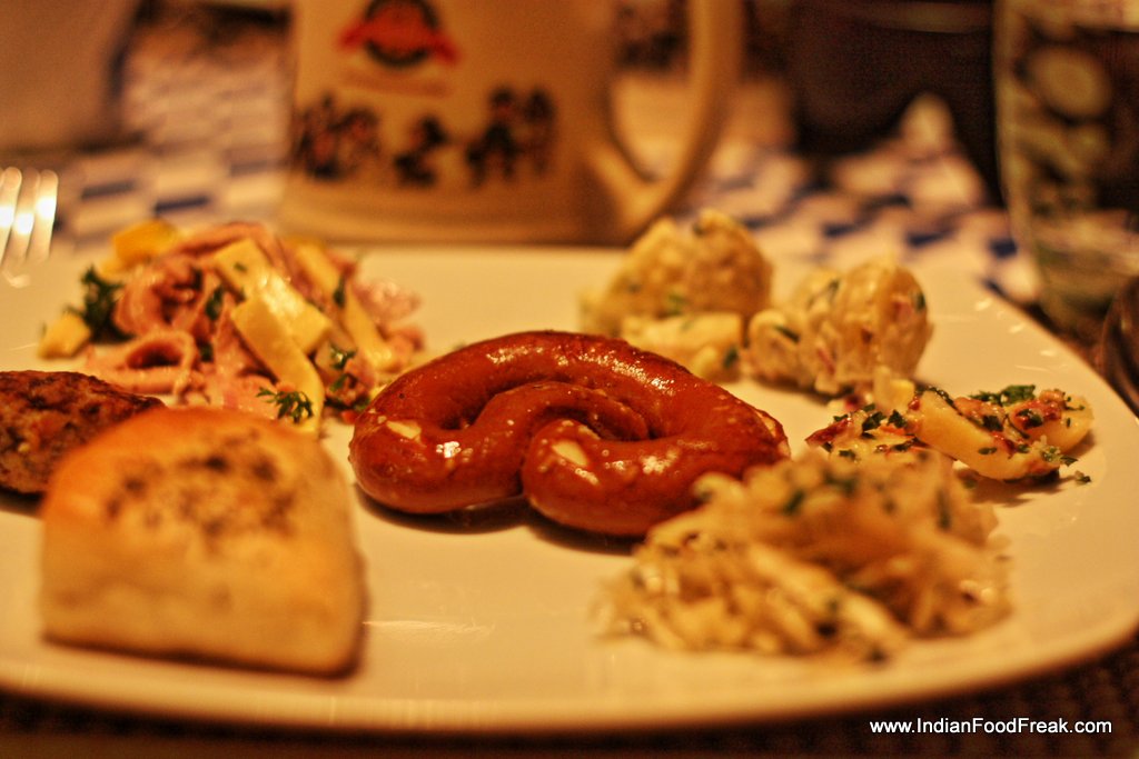 Beer no longer the star of the evening, we shifted our focus to the drool inducing spread. I started with some ‘brotauswahl’ (selection of breads) and of course one could not ignore the variety of pretzels along with beef and vegetable stew soup. Complimenting this was the different selection of salads, my favorite being the potato salad with tiny bits of pork. Being a dedicated non-vegetarian that I am, I needed more meat and quickly moved over to the main course filling my plate up with a pork meat loaf, Bratwurst Mit Senf (Pork Sausage with Mustard), Käsespätzle (Cheese Noodles and bacon) and Geflügel Ragout Fin In Der Koöiginpastete (Ragout fin of chicken with puff pastry). The Käsespätzle and Bratwurst deserve a special mention for having a perfect blend of flavours and the meat being ‘done’ just right. I just had to get another round of these two again, which in hindsight was the reason why I could reach the cheese balls and sauerkraut from the vegetarian fare. Each Bratwurst was like a mini dynamite, it packed a lot of punch and fills you up quite fast.