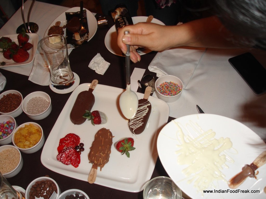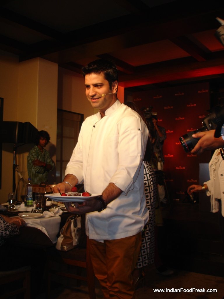 The organizers had paid a lot of attention to detail as the tables were laid with accents, candles and table décor all monogrammed with the magnum M. On each table there were 3 different samples of chocolate chips waiting to be tasted. The very charming and dynamic master chef Kunal Kapoor made an entry to the sound of a resounding applause and went on to explain the nuances of fine chocolates. The chocolate chips set on the table were the same kind as those used in the magnum ice cream and the audience was made to do a taste test and feel how soft, creamy and buttery the chocolate textures felt in the mouth. Another interesting feature to note was that the Chocolate is so fine and pure that it does not leave any residual greasiness in the mouth and melts away easily as soon as it is put in the mouth.