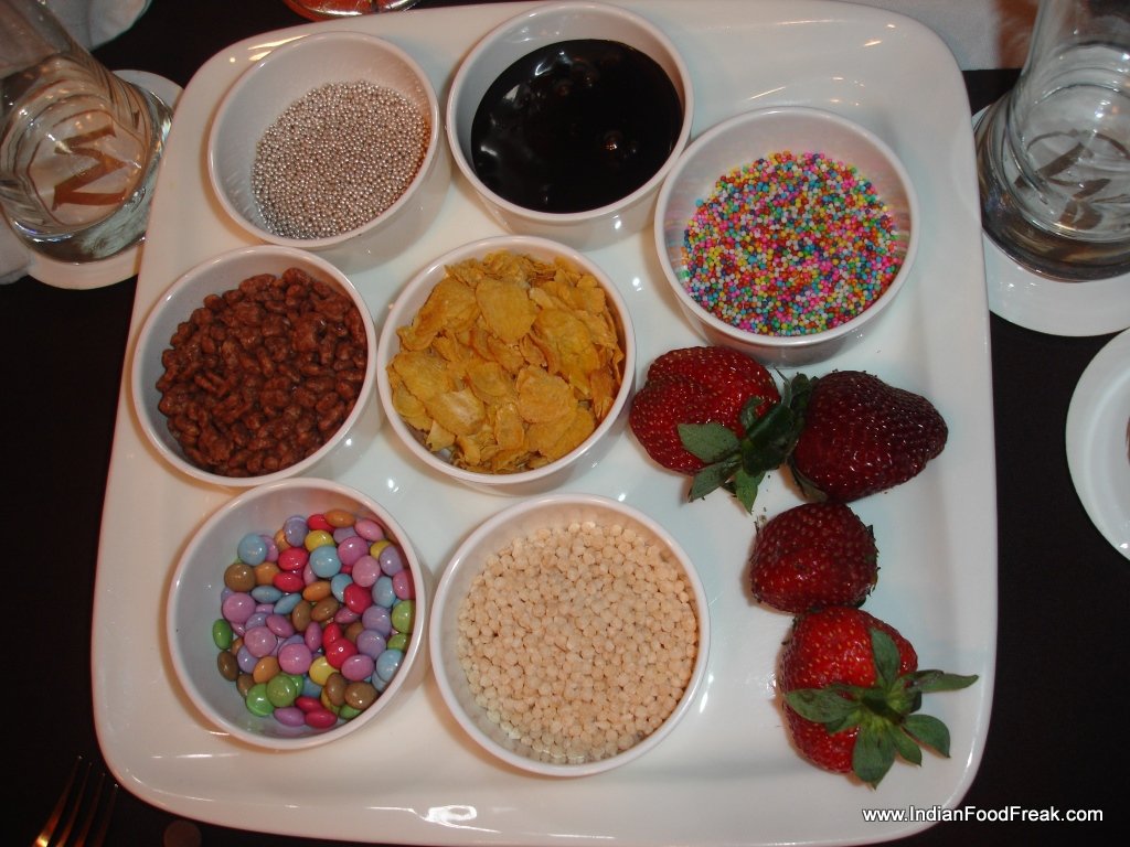 Chef Kunal Kapoor gave us a demo by garnishing the ice cream with some white chocolate sauce, sprinkles and strawberries and encouraged all the bloggers in the room try their hand on it as well. We used the 3 flavours of the ice cream and prepared a presentation using dark and white chocolate sauces, strawberries and silver sprinkles.