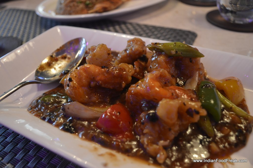 Starters start arriving on the table in quick succession. Wasabi Prawns (Rs 690) are too limp for my liking – something that often happens with frozen and thawed prawns – and lack the punch of the wasabi. Double cooked pork with chilly and black beans (Rs 415) is a good dish, but overdoes on the pork fat, and is a trifle over salted. Water chestnut with baby corn Thai chilly basil (Rs 260) is crisp and piquant making it an addictive bite. Salt and pepper calamari (Rs 390) is a competent dish. Assorted dim sums (Rs 325) are unremarkable. The chef is somewhat at sea with the assorted sushi (Rs 635) where the high proportion of rice to the meats devoids the sushi of its unique texture.