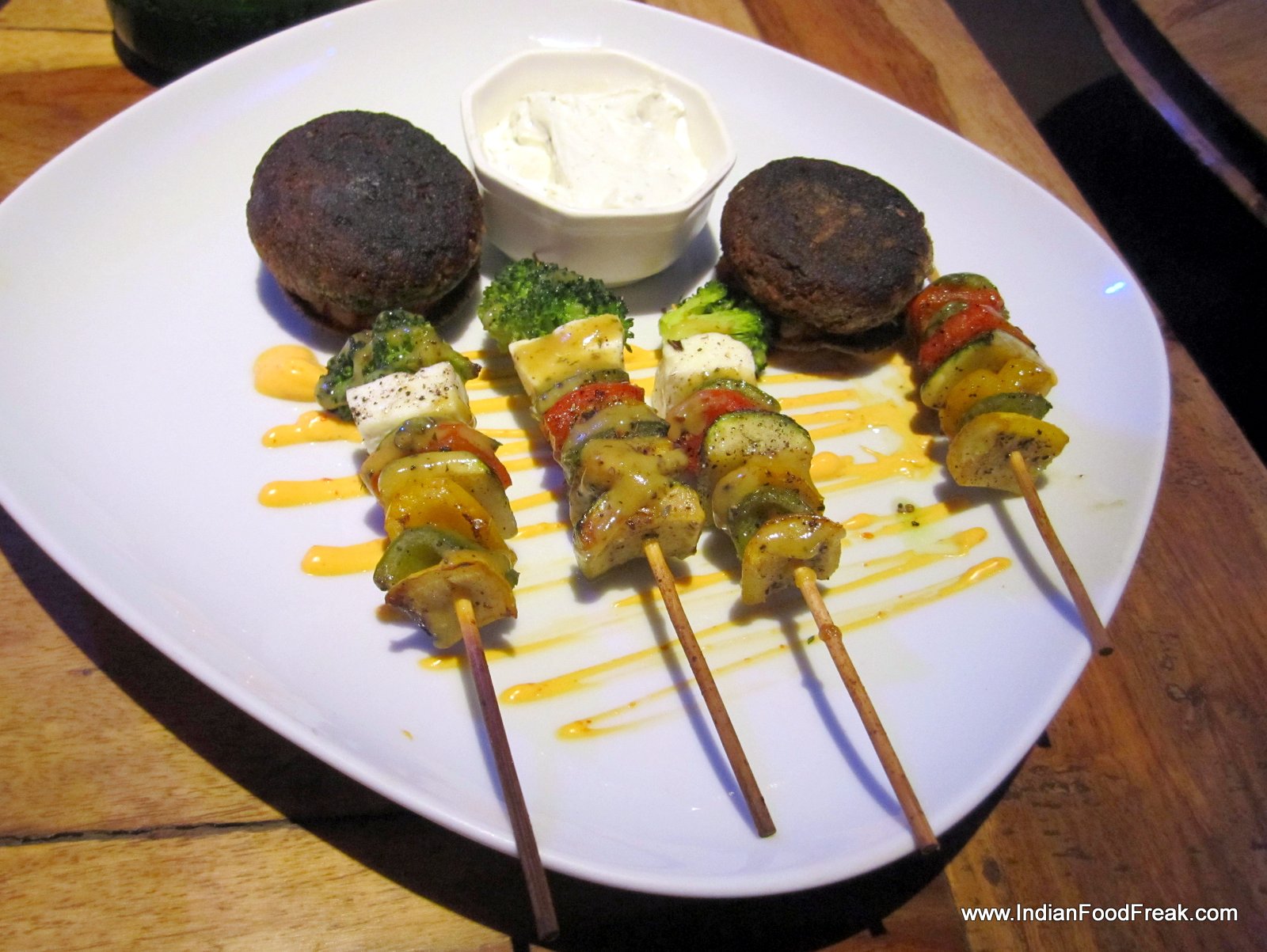 I start the tasting with buckwheat (called kutu ka aata in Hindi) nachos with paprika dust and tomato salsa (Rs 450). These are good nachos combined with a spicy salsa. Spinach and potato roundels with crispy buckwheat florets (Rs 450) is nothing but an aloo palak tikki crowned by a papad like fried kutu. While the dish is edible, it is not much more. Grilled skewers with paprika and rock salt emulsion with yoghurt dip (Rs 450) come next. Here we have paneer cubes, lots of different kinds of bell peppers and zucchini skewered on wooden sticks and grilled. The paneer does not taste fresh, and the taste of the skewered vegetables lacks any depth or twist.