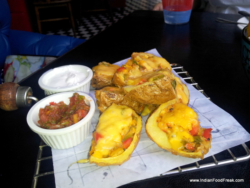 We also tried Stuffed Potato Skins (Rs 180/-). They served it with salsa and sour cream. The dish looked very colorful and delicious but the stuffed potato skins, the salsa and the sour cream were tasteless. Avoidable.