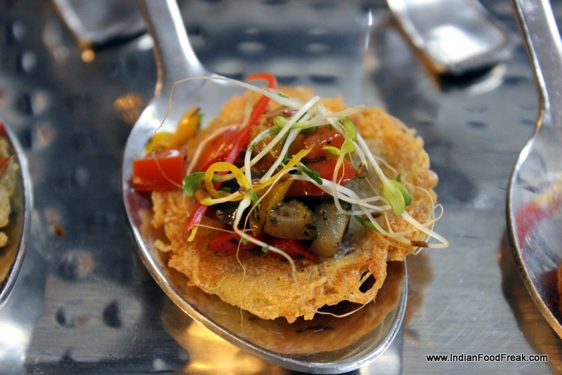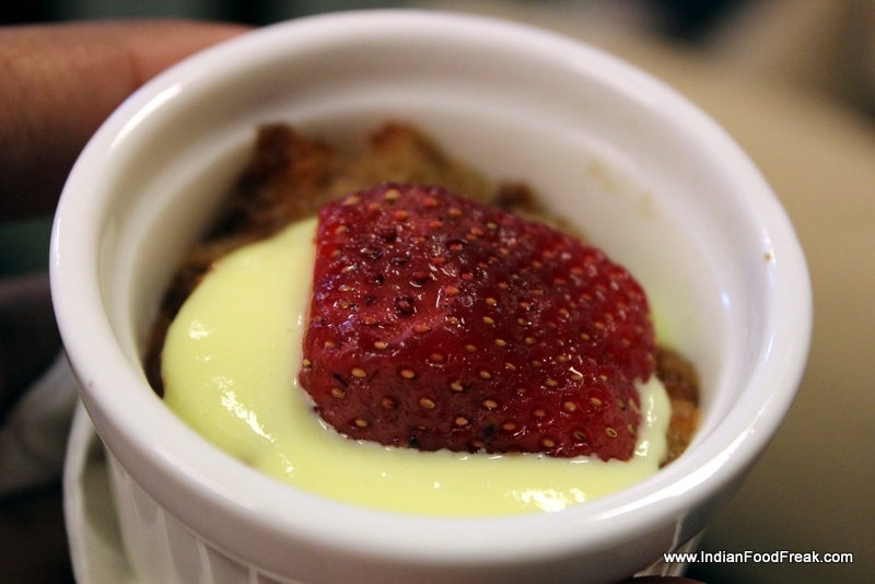 IMG_0634Amongst the most interesting vegetarian things I tried at their place, was a bite sized Pumpkin Gnocchi in butter, herbs and chillies; a Potato Rosti with Smoked Veggies where he had used mesquite wood chips to smoke the veggies, giving them a mellow smoky aroma. Of the non-vegetarian courses, I loved the Bacon and caramelized onion cheese tarts which had sweet onions and bacon in a flaky cheesy tart casing and then the Shepherd’s Pie which was a tad bit over in butter but at the same time quite delicious. Desserts line up was quite decent too with usuals like bread pudding, fruit custard etc. but my favorite was the Chocolate Coated Green Apple on a stick.